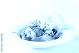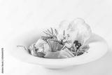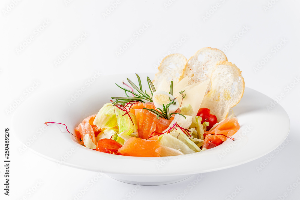 American cuisine concept. Caesar salad with salmon. White plate on a white background. Image for a menu of restaurants or cafes.