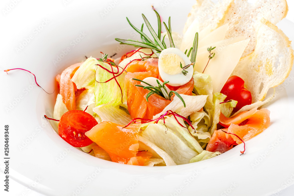 American cuisine concept. Caesar salad with salmon. White plate on a white background. Image for a menu of restaurants or cafes.