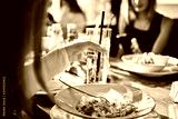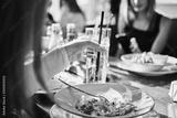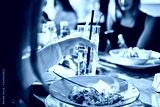 Young friends dine in the cafe outdoors. Close-up image of a table with different dishes and drinks