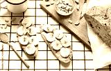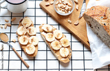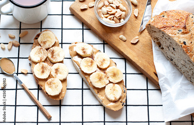 Peanut toasts with banana slices breakfast flat lay with cup of tea. Top view healthy food composition