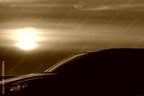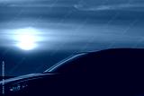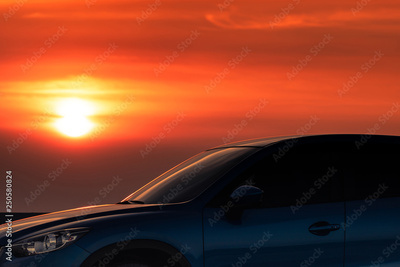 Blue compact SUV car with sport and modern design parked on concrete road by the sea at sunset in the evening. Hybrid and electric car technology concept. Car parking space. Automotive industry.