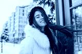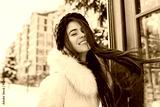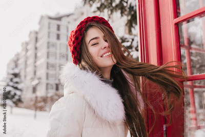 Portrait smiling winter girl with long brunette hair in red knitted hat chilling on street near red telephone box. Snow, cold weather, sunny morning, brightful emotions, happiness