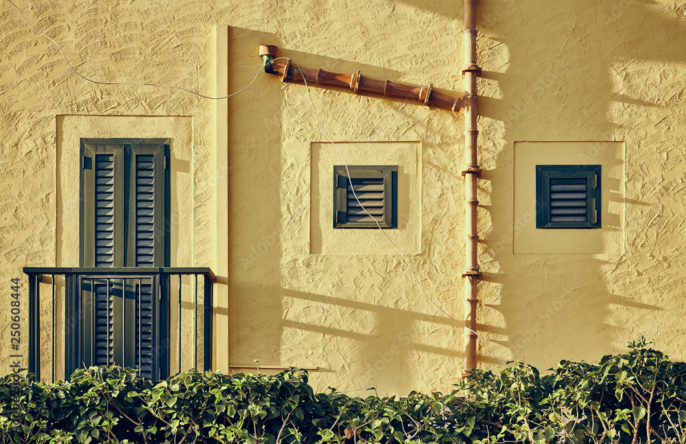 Yellow rugged wall with shutters and old ceramic gutter, color toned picture.