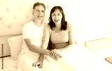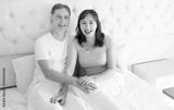 Middle aged senior couple in bed. Family happy relationship man and woman at bedroom interior. Sexual health and menopause period concept. Template blank t shirt. Copy space