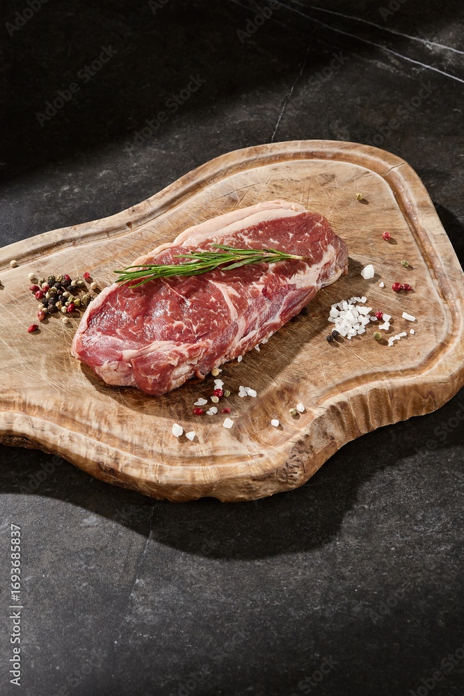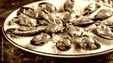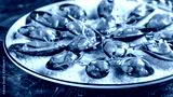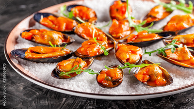 European cuisine. Marinated mussels in tomato sauce with rosemary, garlic, chili. Serving dishes in the restaurant on a plate with coarse sea salt on a black background. copy space