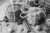 Various shortbread, oat cookies, chocolate chip biscuit and spice on dark rustic wooden table.