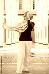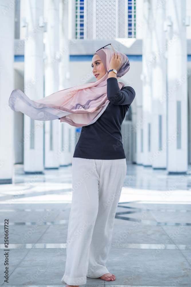 Portrait of happy young woman wearing modern stylish hijab