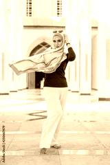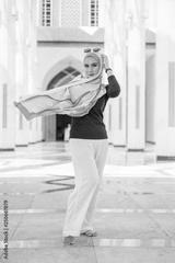 Portrait of happy young woman wearing modern stylish hijab