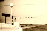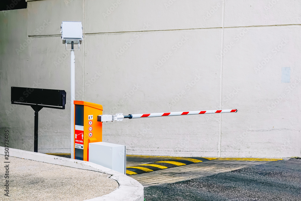 Car park barrier, Security system for building access - barrier gate stop with traffic cones and cctv
