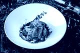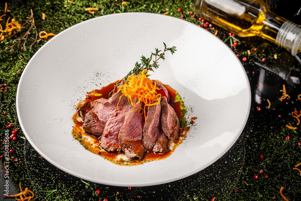 European cuisine. Marinated veal with roast Medium rare. Degree of roasting. Chef pours beef olive oil. Serving dishes in restaurant in a white plate. background image, copy space