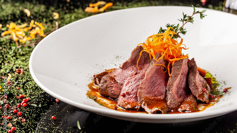 European cuisine. Marinated veal with roast Medium rare. Degree of roasting. Chef pours beef olive oil. Serving dishes in restaurant in a white plate. background image, copy space