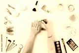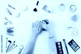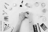 Make up products with woman doing nail polish