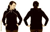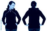 Front back and rear black sweatshirt view. Woman in template hoody clothes for print and copy space isolated on white background. Hoody Mockup