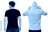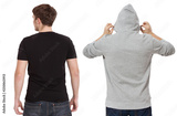 T shirt and sweatshirt template. Men in black tshirt and in grey hoody. Back rear view. Mock up isolated on white background. Copy space. Place for print.