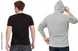 T shirt and sweatshirt template. Men in black tshirt and in grey hoody. Back rear view. Mock up isolated on white background. Copy space. Place for print.