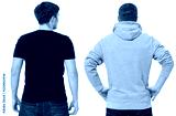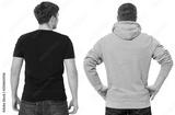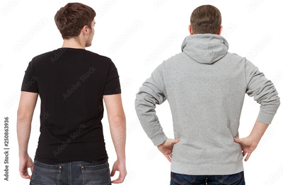 T shirt and sweatshirt template. Men in black tshirt and in grey hoody. Back rear view. Mock up isolated on white background. Copy space. Place for print.