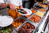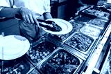Food court in the shopping mall of Bali island, Indonesia. Restaurant, store, indoor.