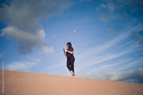 Pretty woman with mobile phone in a desert dune.