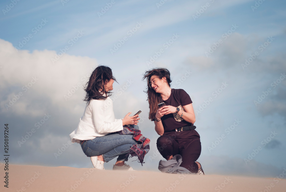 Two women have fun in the sand of the desert dunes.