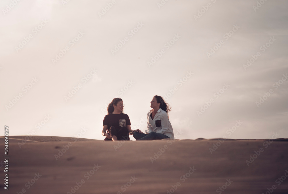 Two women have fun in the sand of the desert dunes.