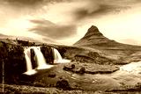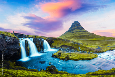 Colorful sunrise on Kirkjufellsfoss waterfall. Amazing morning scene near Kirkjufell volkano, Iceland