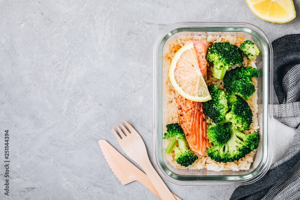 Meal prep lunch box containers with baked salmon fish, rice, green broccoli