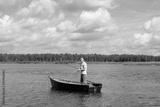 a man standing in a boat fishing for fishing on a lake in the forest