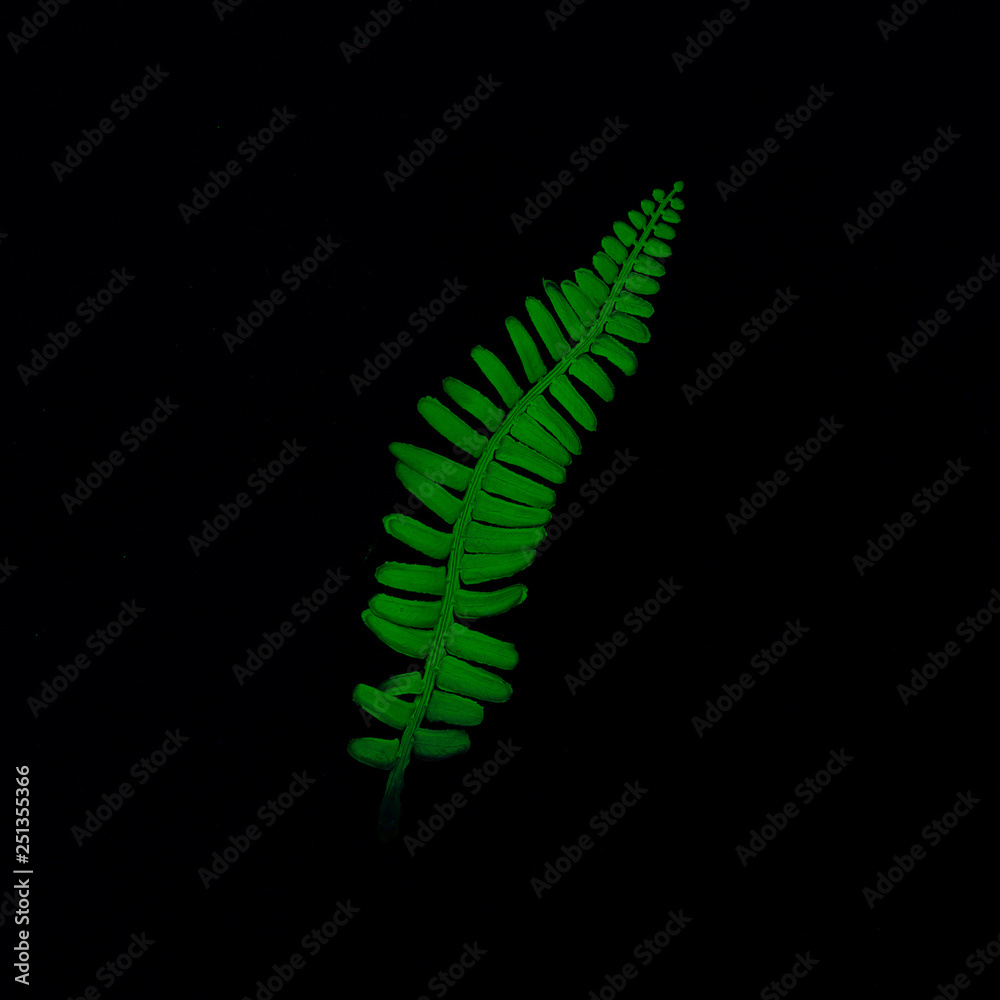 Neon tropical leaf in vivid green fluorescent color on black background. Summer colorful nature concept.