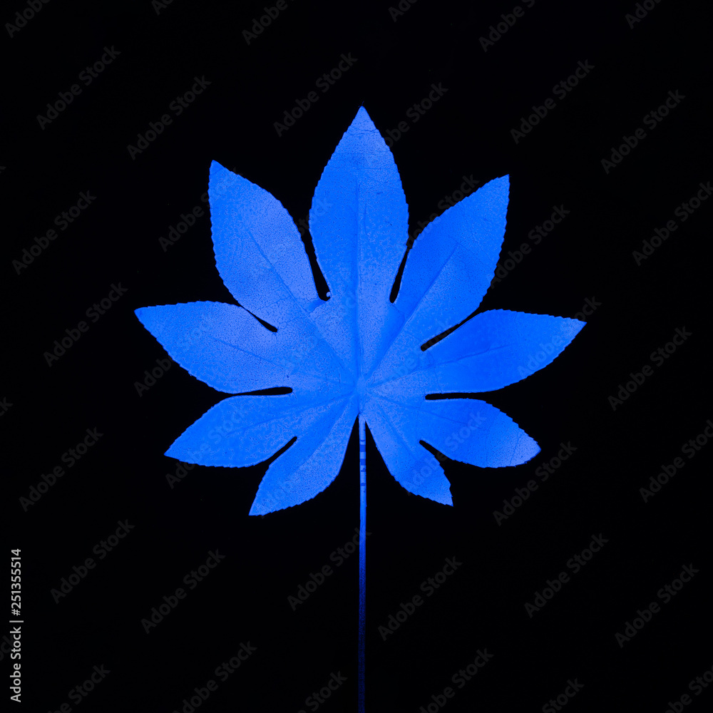 Neon tropical leaf in vivid blue fluorescent color on black background. Summer colorful nature concept.