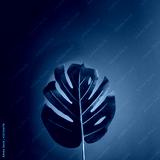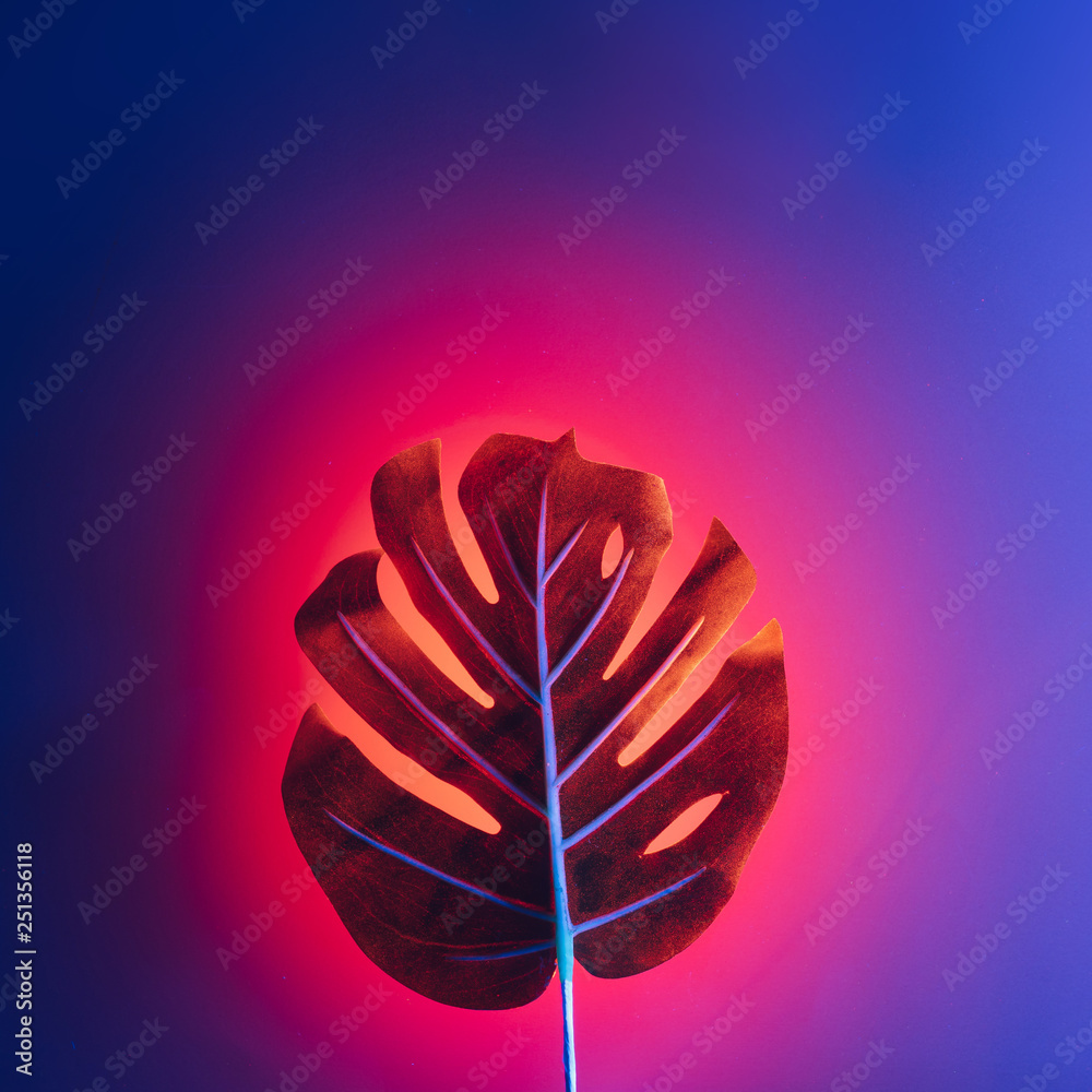 Neon tropical leaf inred and blue vivid fluorescent color. Summer colorful nature concept background.