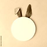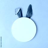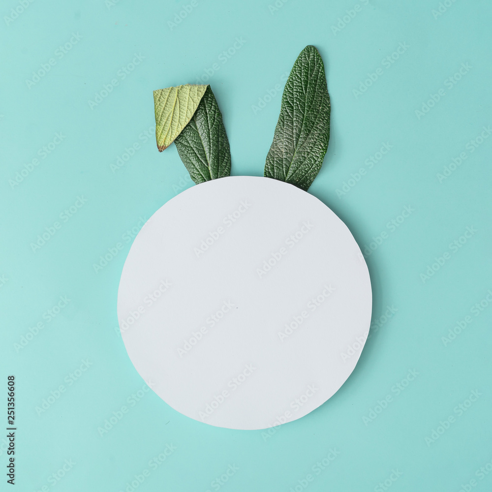Happy Easter minimal concept. Bunny rabbit ears made of natural green leaves on pastel blue background with circle copy space. Flat lay.