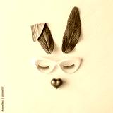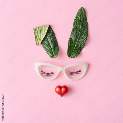 Happy Easter minimal concept. Bunny rabbit face made of natural green leaves with glasses and red heart on pastel pink background. Flat lay.