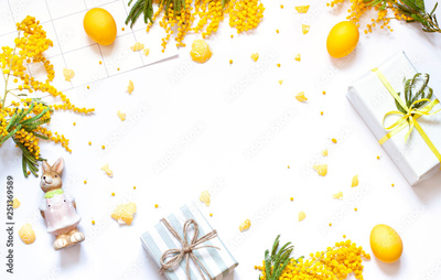 Easter concept frame with eggs, a bunny, mimosa flowers and gifts. Top view composition. Copy space