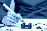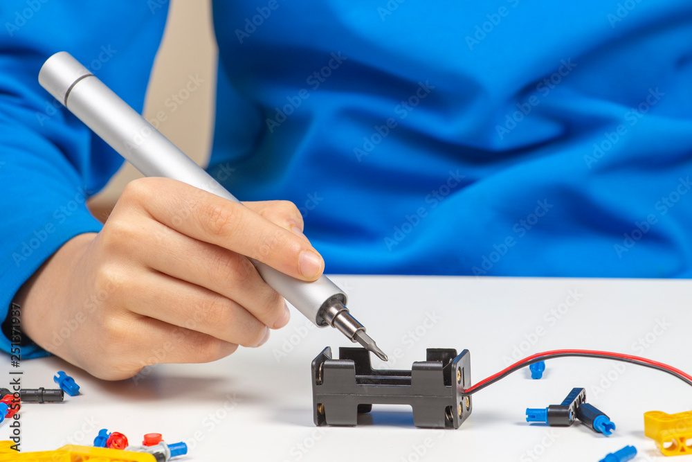 Child hands making robot car. Robotic, learning, technology, stem education for children background