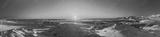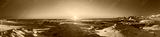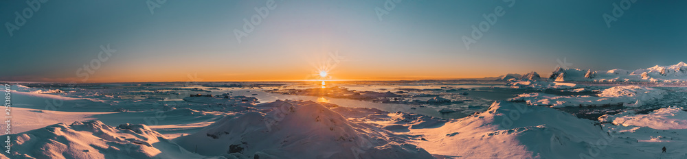 Bright colorful sunset panorama view in Antarctica. Orange sun lights over the snow covered polar surface. Picturesque winter landscape. The beauty of the wild untouched Antarctic nature.