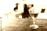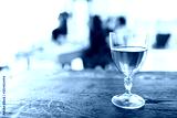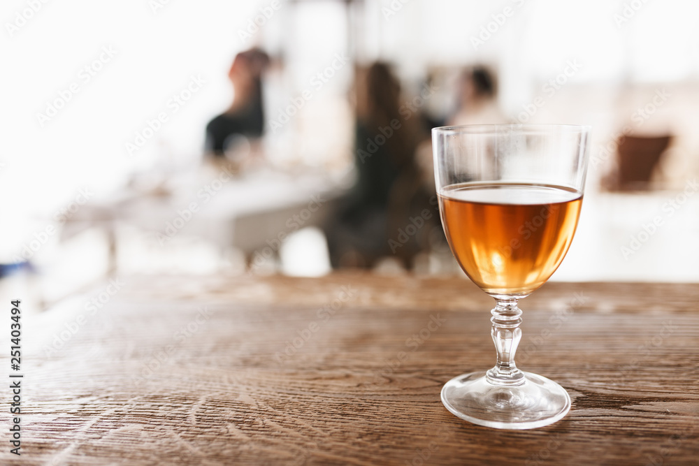 Close up glass of wine on wood table in cozy kitchen with fuzzy background isolated