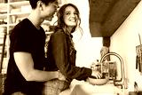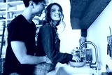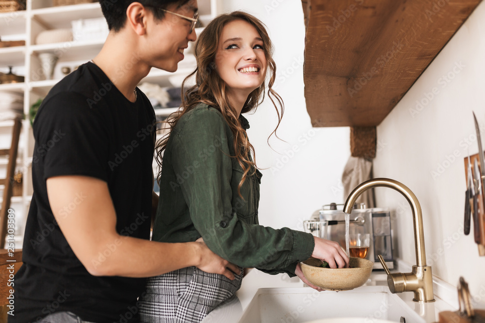 Pretty smiling woman happily looking aside washing dish asian man behind embracing her. Young international couple joyfully spending time together in kitchen at home