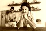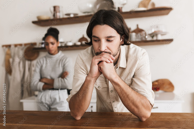 Sad man with beard leaning on table thoughtfully looking aside with angry african american woman on background. Young international couple in quarrel spending time in kitchen