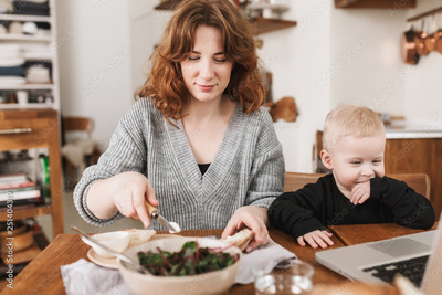 Young beautiful woman with red hair in sweater dreamily cooking with her little son near happily watching cartoons on laptop. Mom spending time with baby in kitchen at home