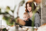 Young beautiful woman with red hair in knitted sweater sitting at the table dreamily feeding her little son. Mom thoughtfully spending time with baby boy in kitchen at home