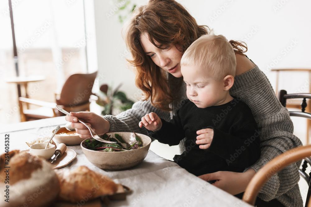 Young beautiful woman with red hair in knitted sweater sitting at the table dreamily feeding her little son. Mom spending time with baby boy in kitchen at home