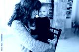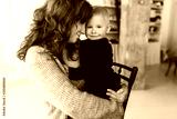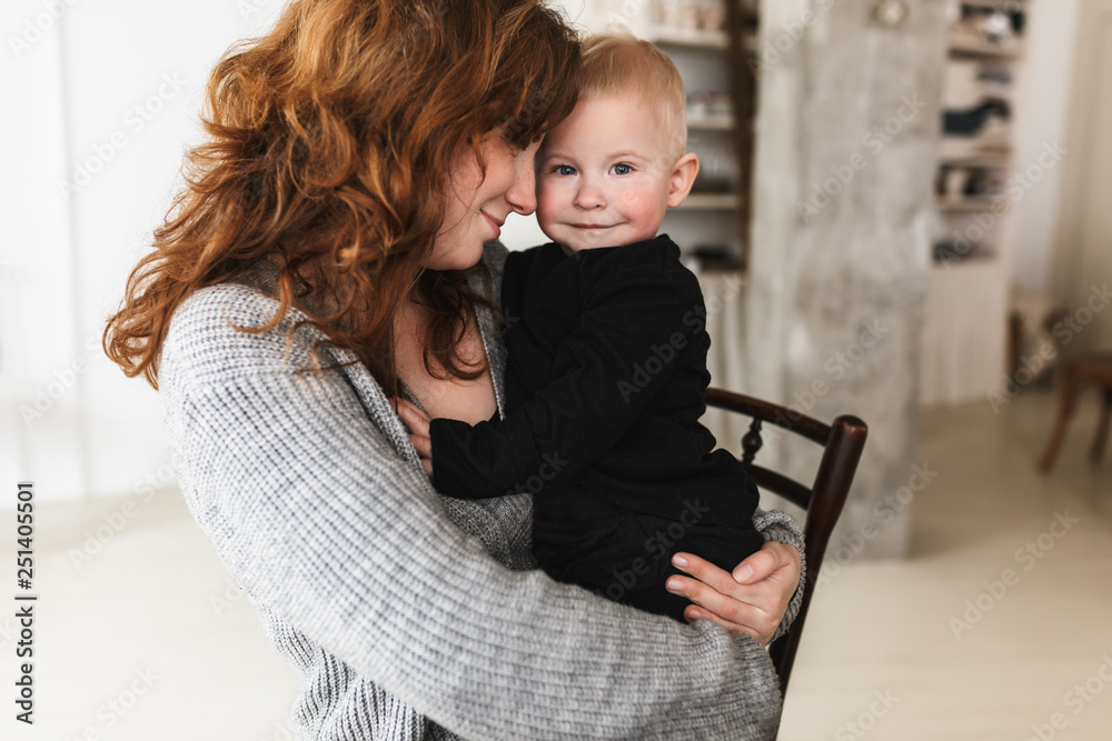 Young pretty woman in knitted sweater hugging her little smiling son that happily looking in camera. Mom with baby boy dreamily spending time together in room at home