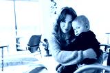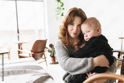 Young beautiful woman in knitted sweater hugging her little son dreamily looking in camera together. Mom with baby boy spending time in room at home