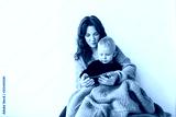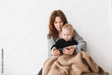 Young beautiful mom with red hair in knitted sweater sitting on floor with her little son covering with blanket thoughtfully using cellphone while spending time together over white background