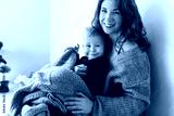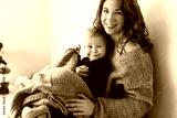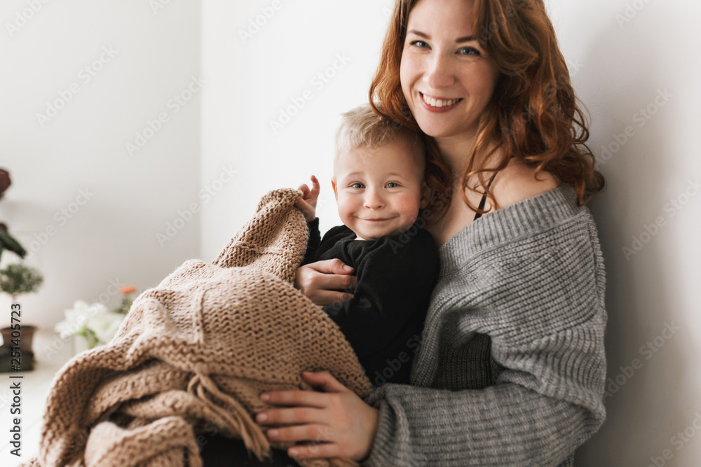 Young gorgeous mom with red hair in knitted sweater sitting on floor holding her little joyful son covering with blanket happily looking in camera together spending time at home