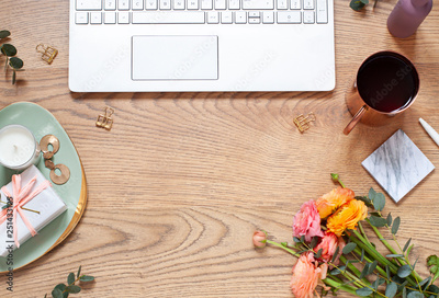 Workplace concept flat lay with a bouquet and a keyboard. Womens day or Mothers day card. Top view. Copy space