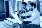 Male architect and bearded client with house plan in hand sitting on folded boards.