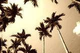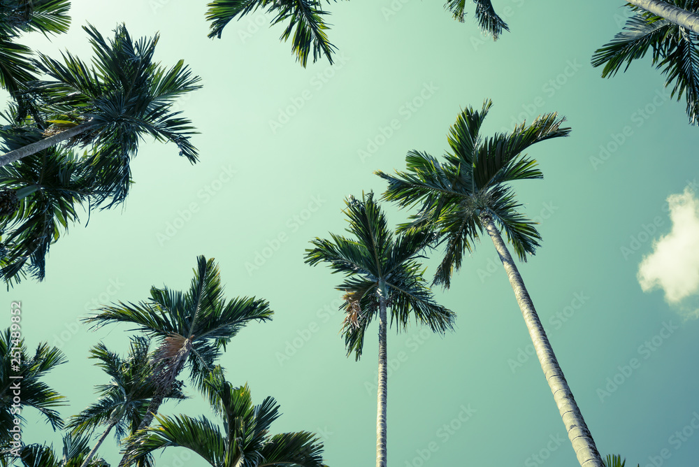 Areca nut or Betel Nuts palm tree with blue sky and clouds background in Thailand. Agriculture plantation or tropical summer beach holiday vacation traveling, resort hotel business concept.