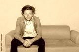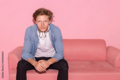 Portrait cool guy. Charming handsome young man looks confident and determined. Attractive handsome guy wear jeans, denim shirt, t shirt. He sits on pink sofa. pink wall background, copy space