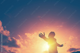Copy space of man rise hand up on top of mountain and sunset sky abstract background.